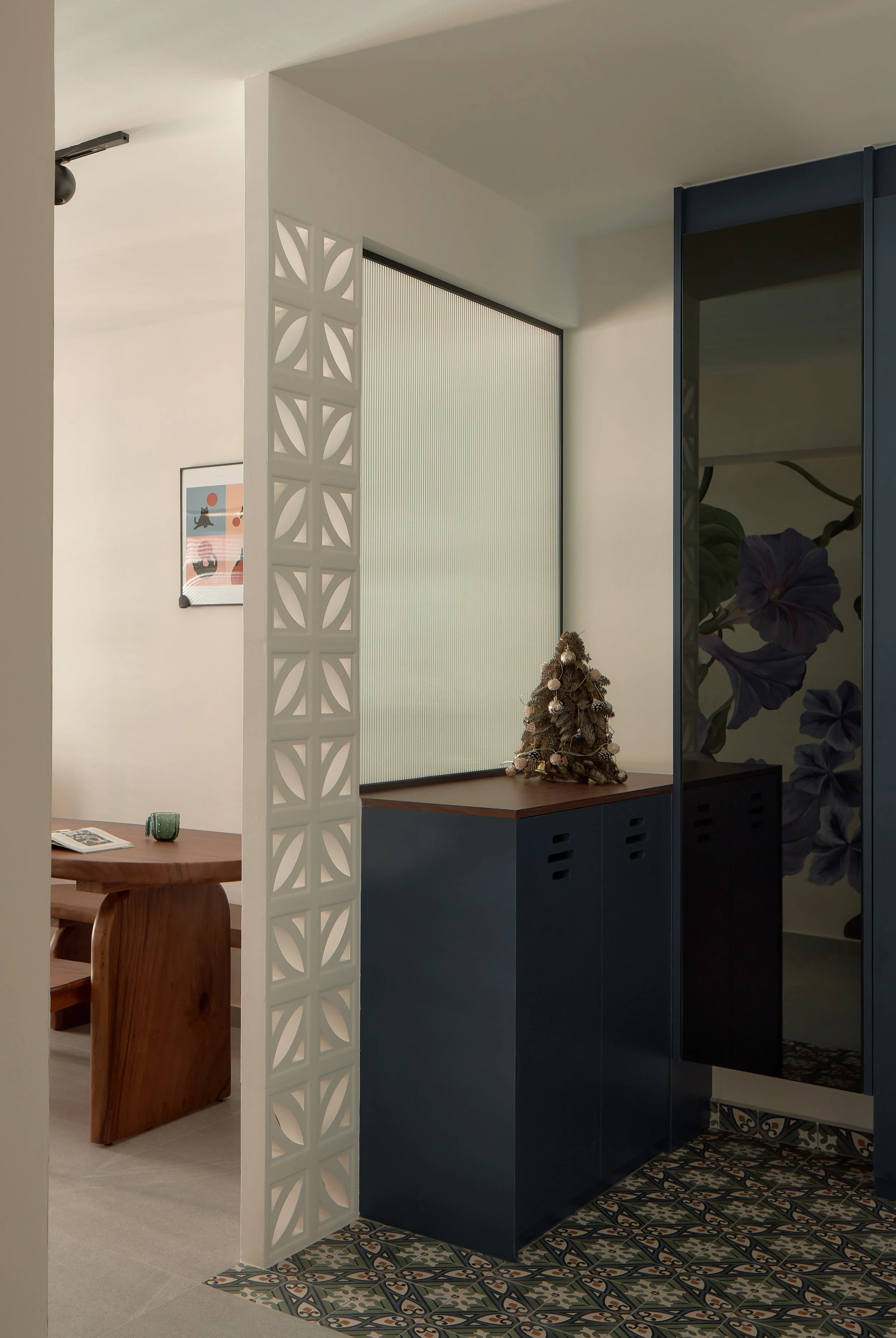 A breeze block divider gently filters light, while patterned tiles ground the entrance with character.